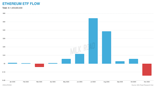 In an X post, a crypto analyst known as Milk Road revealed that the Ethereum ETFs had just printed their worst month on record since launch, which is roughly $1.4 billion in net outflows, the largest single-month withdrawal that ETH has ever encountered.